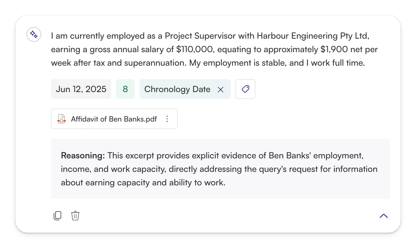 CORTO doesn't just find facts - it explains their relevance. Every AI suggestion comes with its source and a clear explanation of why it was surfaced. This transparency allows you to quickly validate key pieces of evidence and weave them into your narrative to strengthen your case.