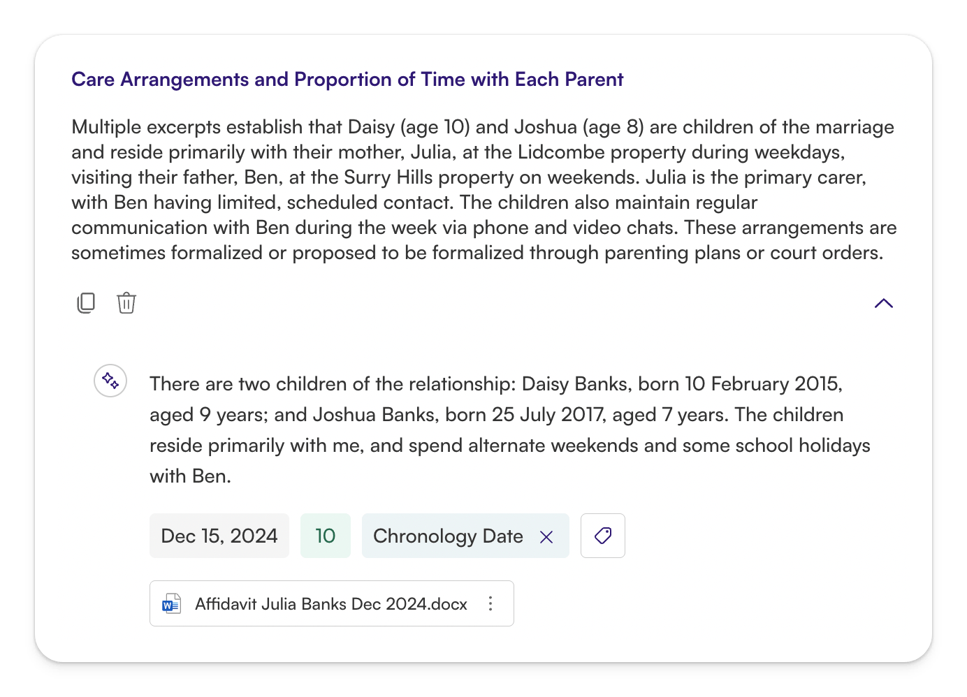 The facts feature collates crucial information from across your documents. You can create and manage definitive fact lists tied to your legal points, ensuring every critical detail is at your fingertips. This keeps your case strategy focused and your team aligned from the outset.