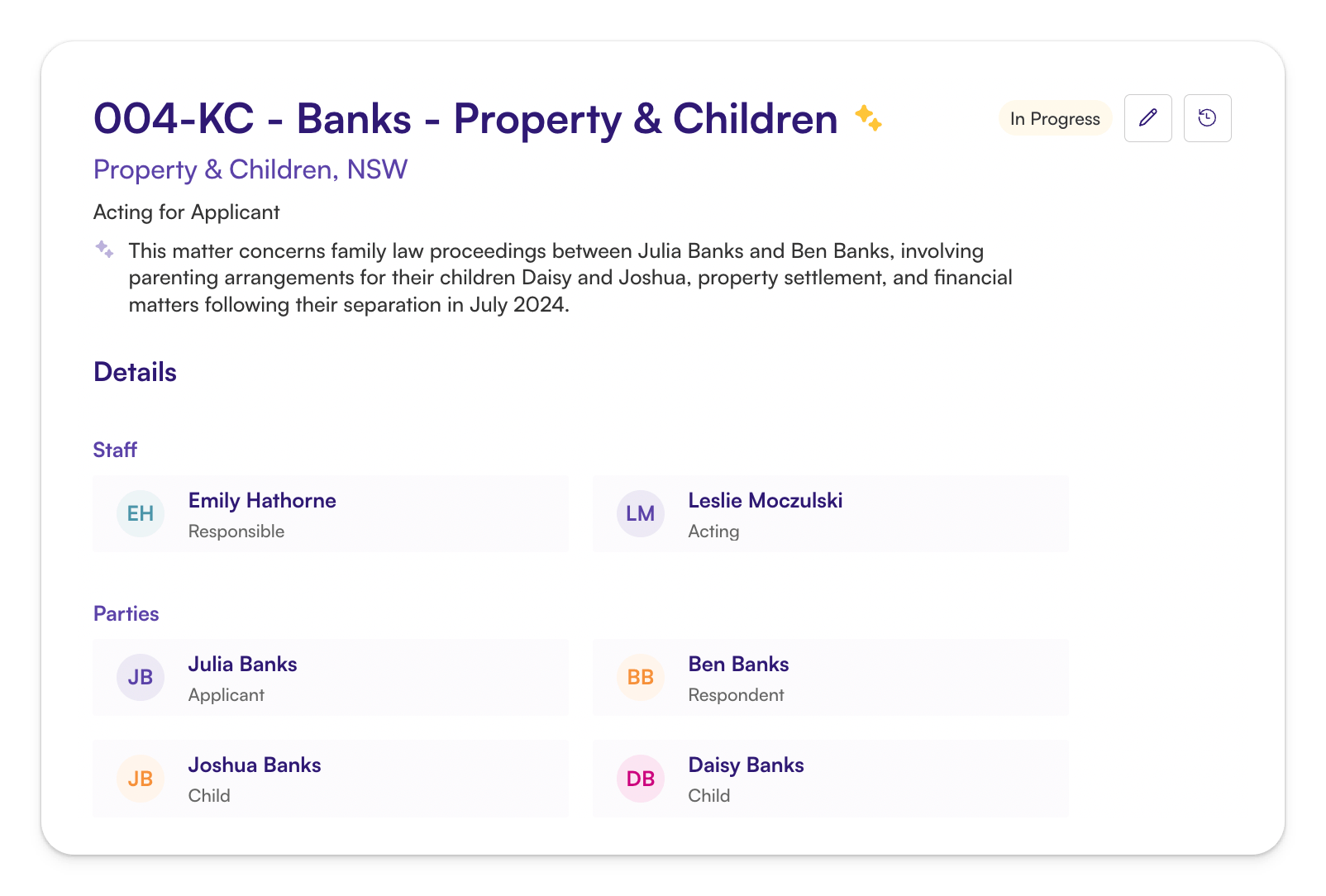 CORTO’s matter details view centralises all critical matter information. Our AI instantly extracts key details from uploaded documents, including parties, dates, and court references, which eliminates manual data entry and reduces the risk of human error. This builds a complete and consistent foundation for every matter.