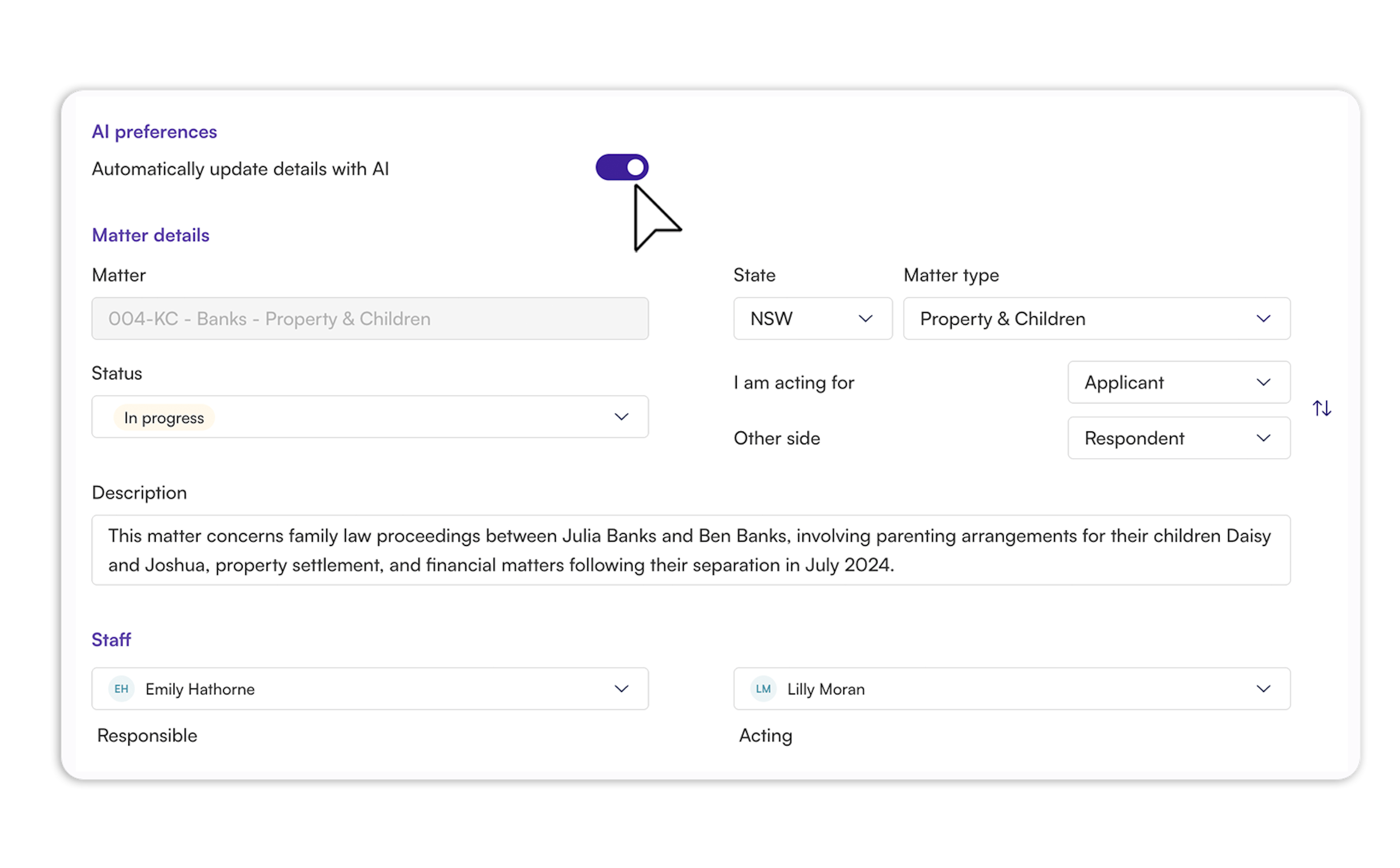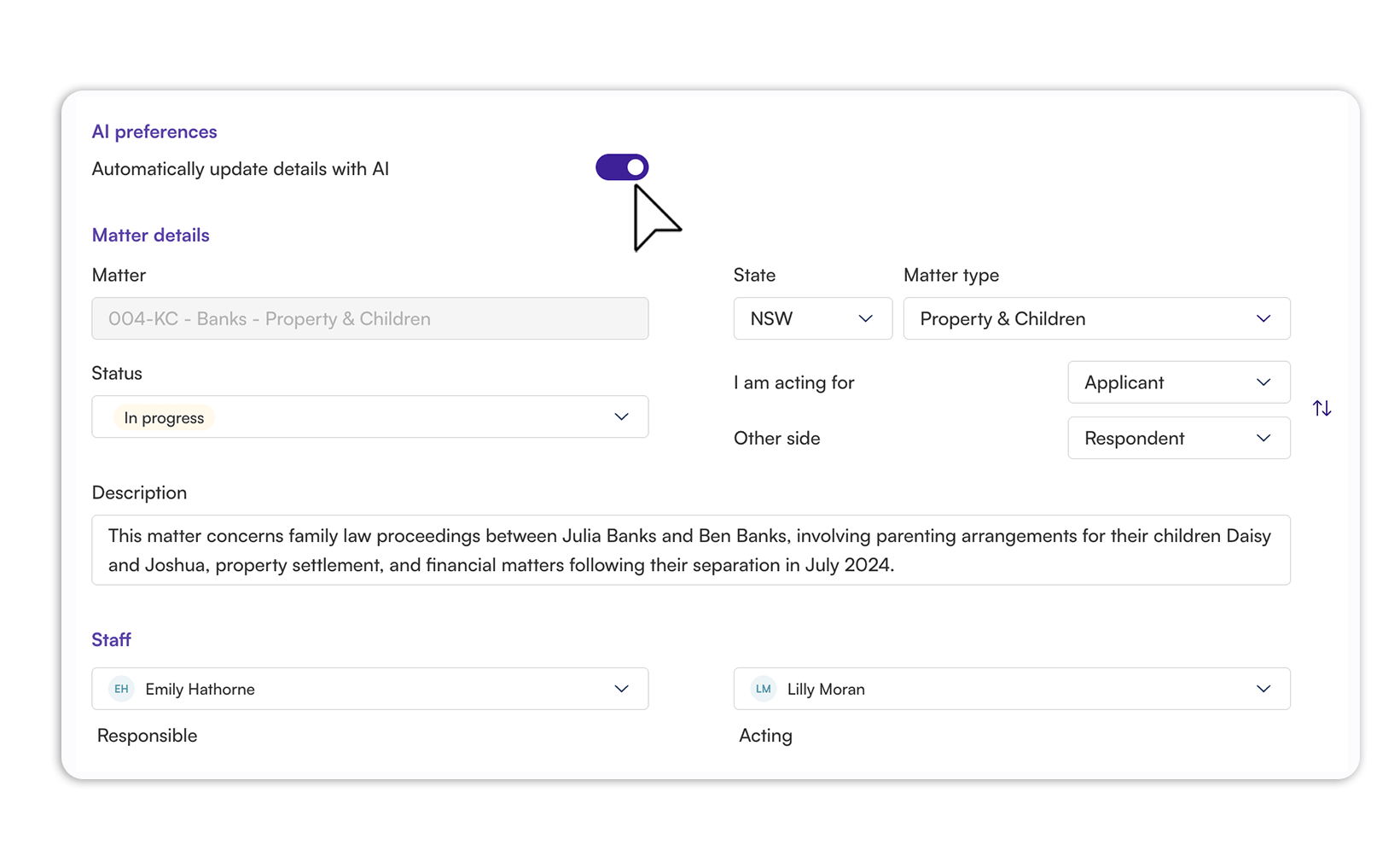 Lock key matter details, manage contacts manually, or toggle auto-updates based on matter sensitivity.